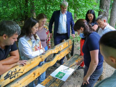 Заместитель главы администрации Котельников Ирина Копыльченко совместно с начальником отдела лесного хозяйства Денисом Быченковым встретились с жителями в Томилинском лесопарке, чтобы обсудить строительство детской площадки.